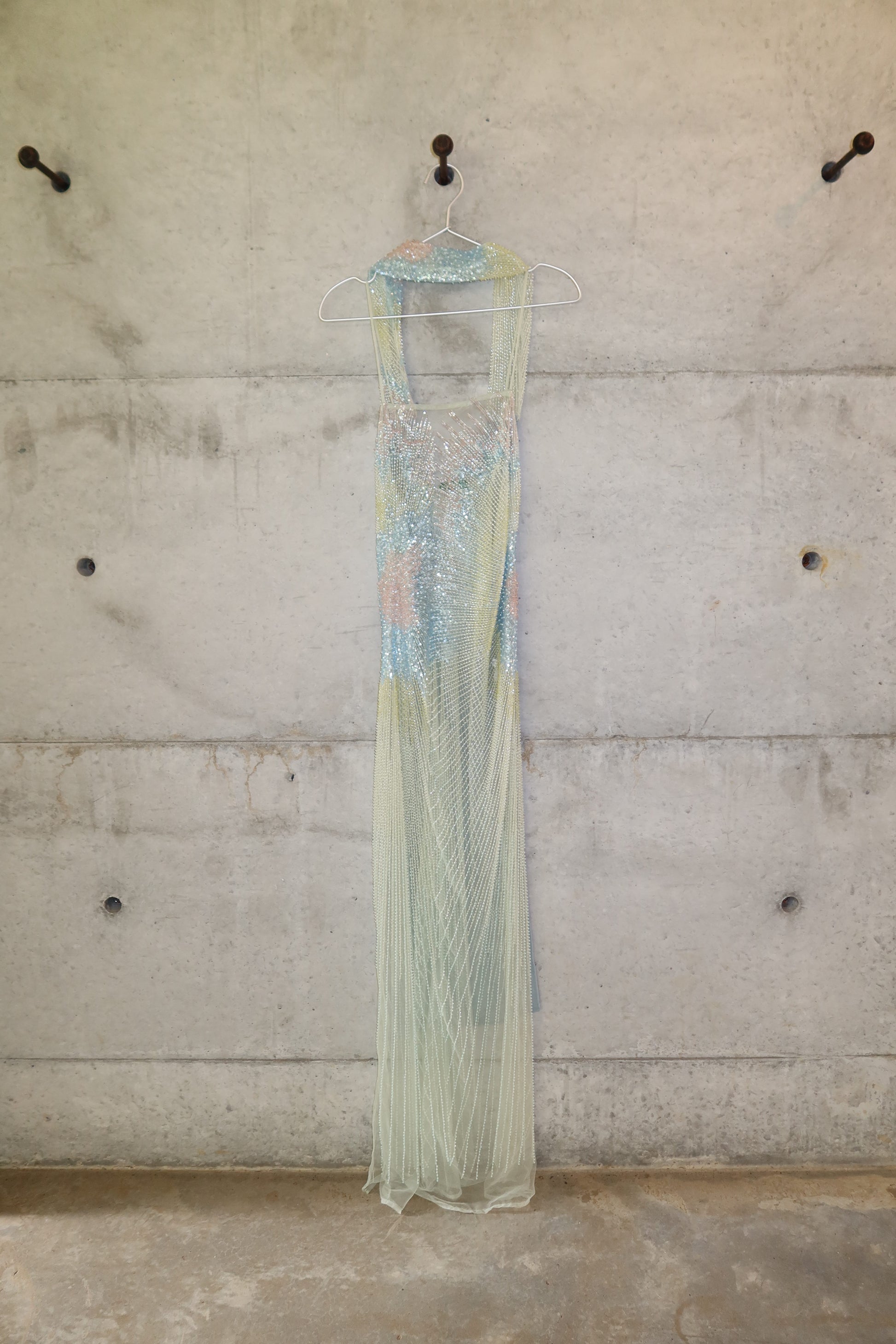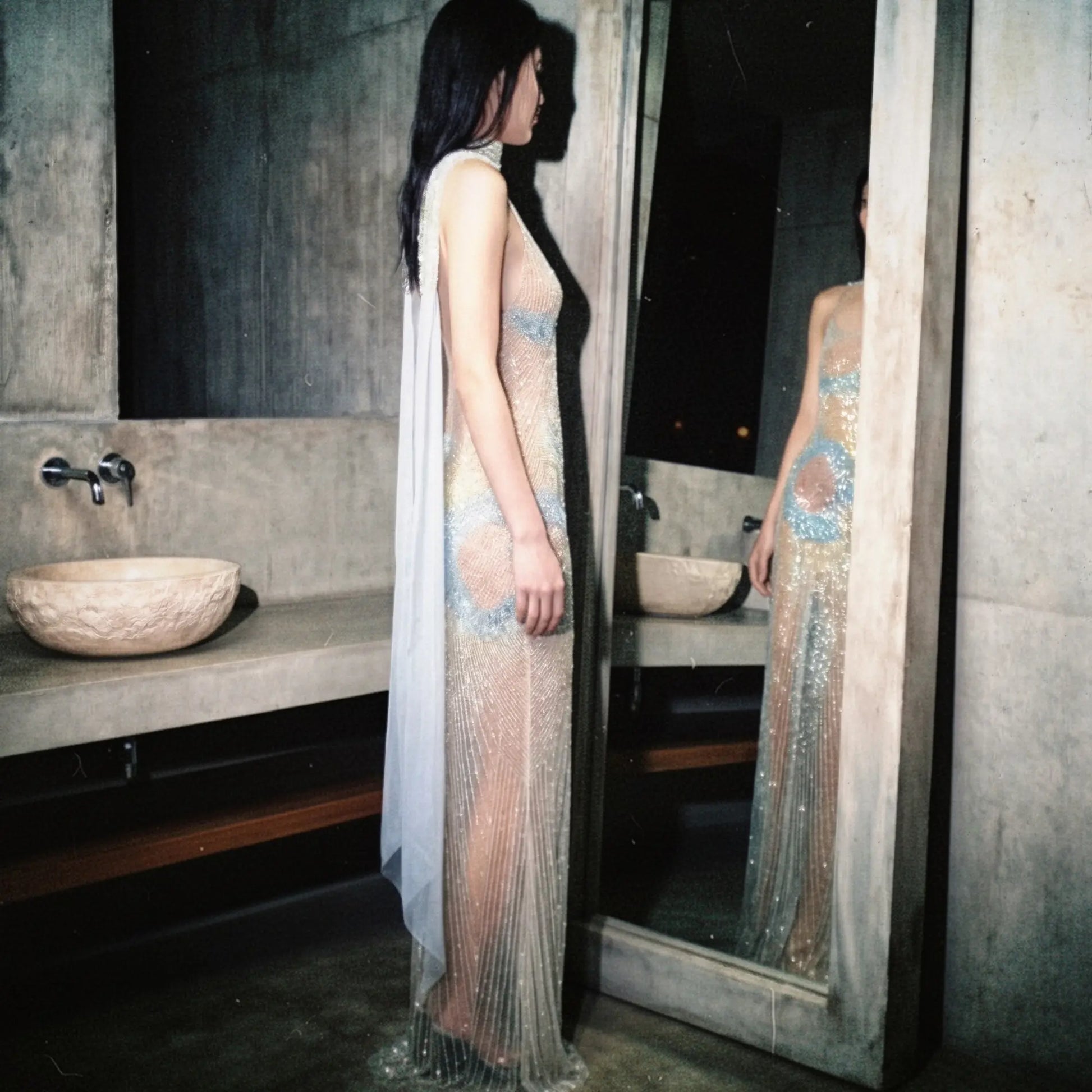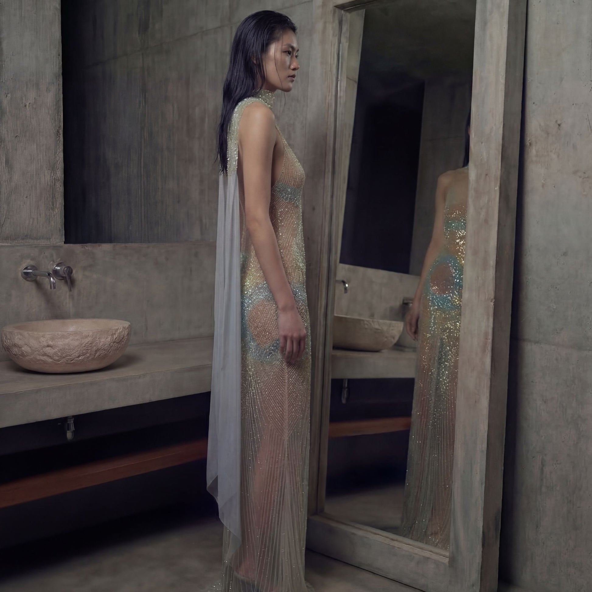 Sheer and sculptural, the silhouette drapes fluidly across the body, casting soft shadows and catching light with subtle glimmer. Delicate ties and textured detailing create tension within the form, while the barely-there construction is intentional revealing just enough, withholding the rest.
